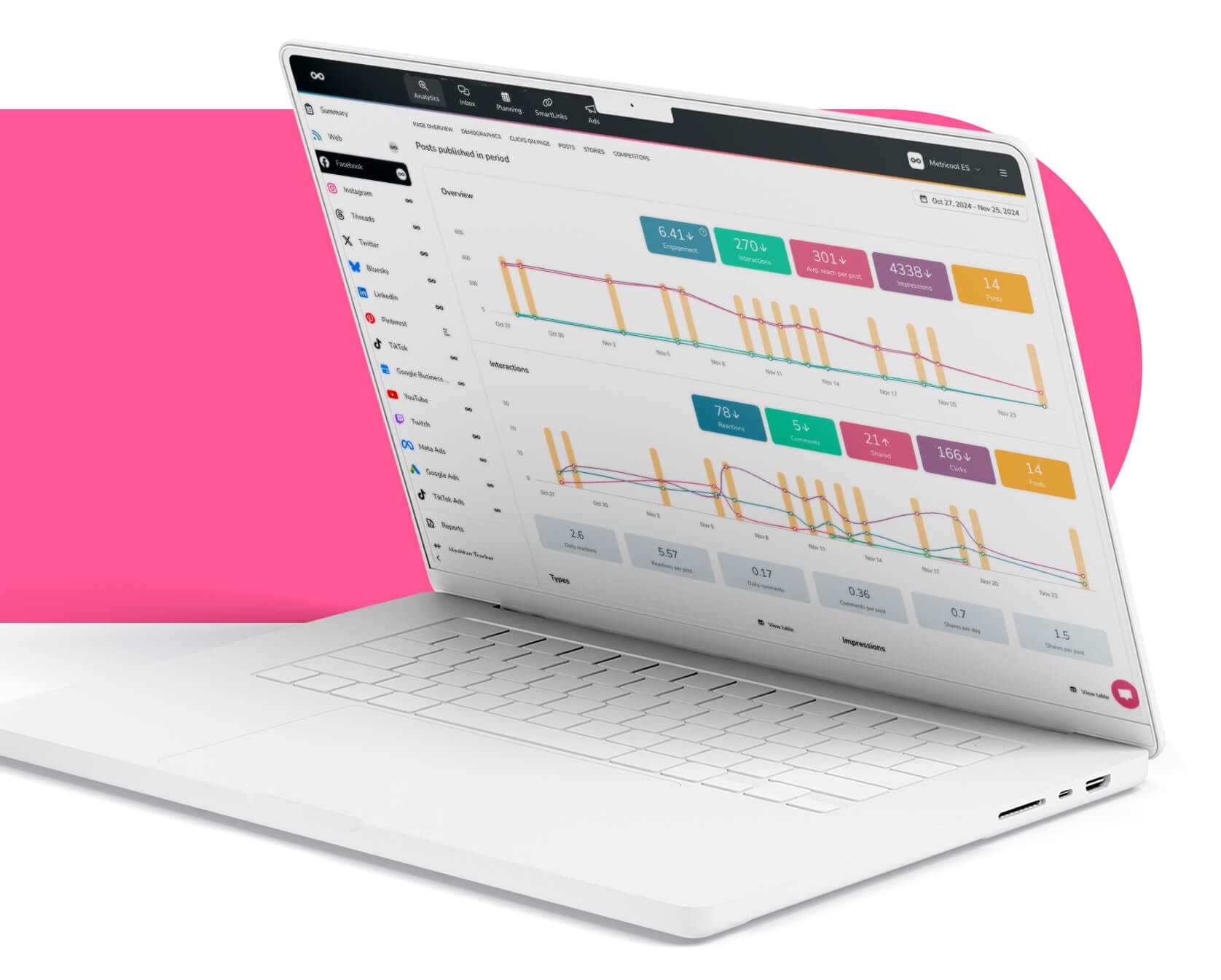 Connect all your social media profiles to Metricool and use your time to take care of your business. In addition to Facebook, you can schedule, measure, and create reports for Instagram, TikTok, X, Bluesky, Threads, Facebook, Pinterest, YouTube, LinkedIn, Twitch, Google Business Profile, and online ad platforms.