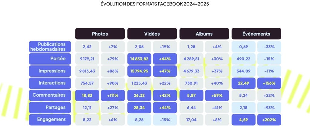Selon l’étude des réseaux sociaux de Metricool, la portée des vidéos Facebook à encore augmenté par rapport à l’année dernière. C’est d’ailleurs le format qui domine tous les indicateurs importants :