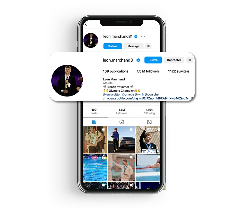 Léon Marchand utilise sa bio pour affirmer sa place de champion olympique tout en ajoutant des éléments distinctifs de son image. Ses partenariats avec des marques prestigieuses comme Louis Vuitton et Porsche renforcent son statut d’athlète de haut niveau.