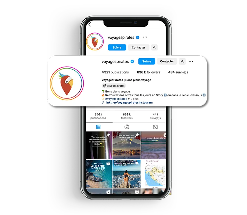 Voyages Pirates propose une bio où chaque élément apporte un +. L’emoji 🌴 donne le contexte, tandis que les mentions offres en Story offrent des plans de dernière minute. Les hashtags, quant à eux, sont là pour renforcer l’idée d’une communauté de voyageurs.