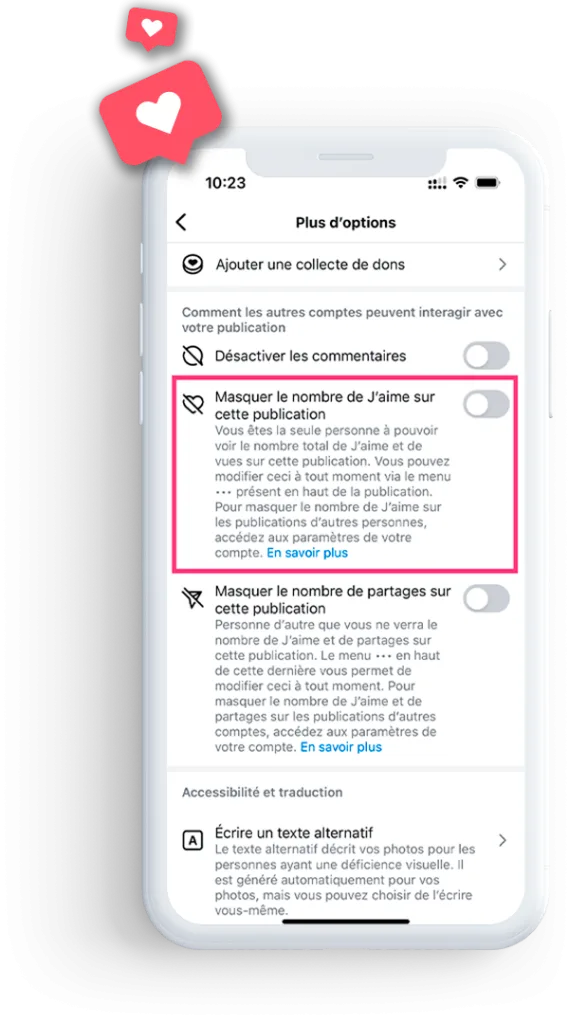 - Désactivez l’option « Masquer le nombre de J’aime sur cette publication ».