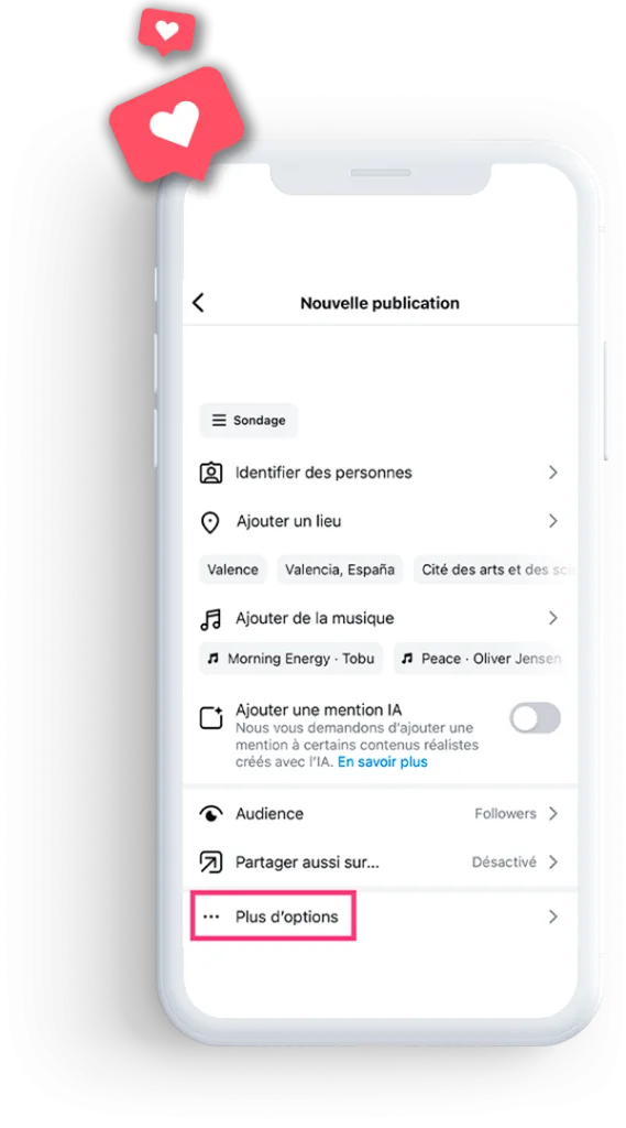 - Avant de publier une photo ou une vidéo, cliquez sur « Plus d’options ».