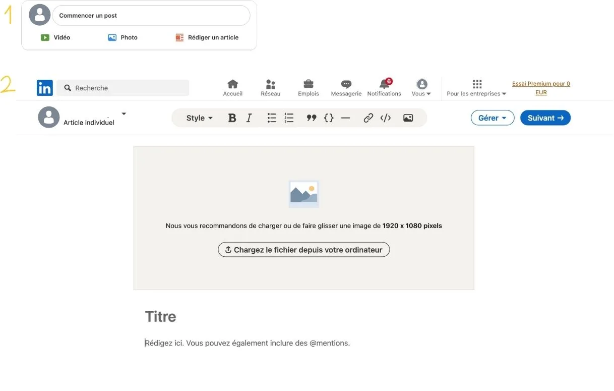 Vous pouvez décider de publier un article sous votre propre profil, ou bien directement sur votre page d’entreprise.