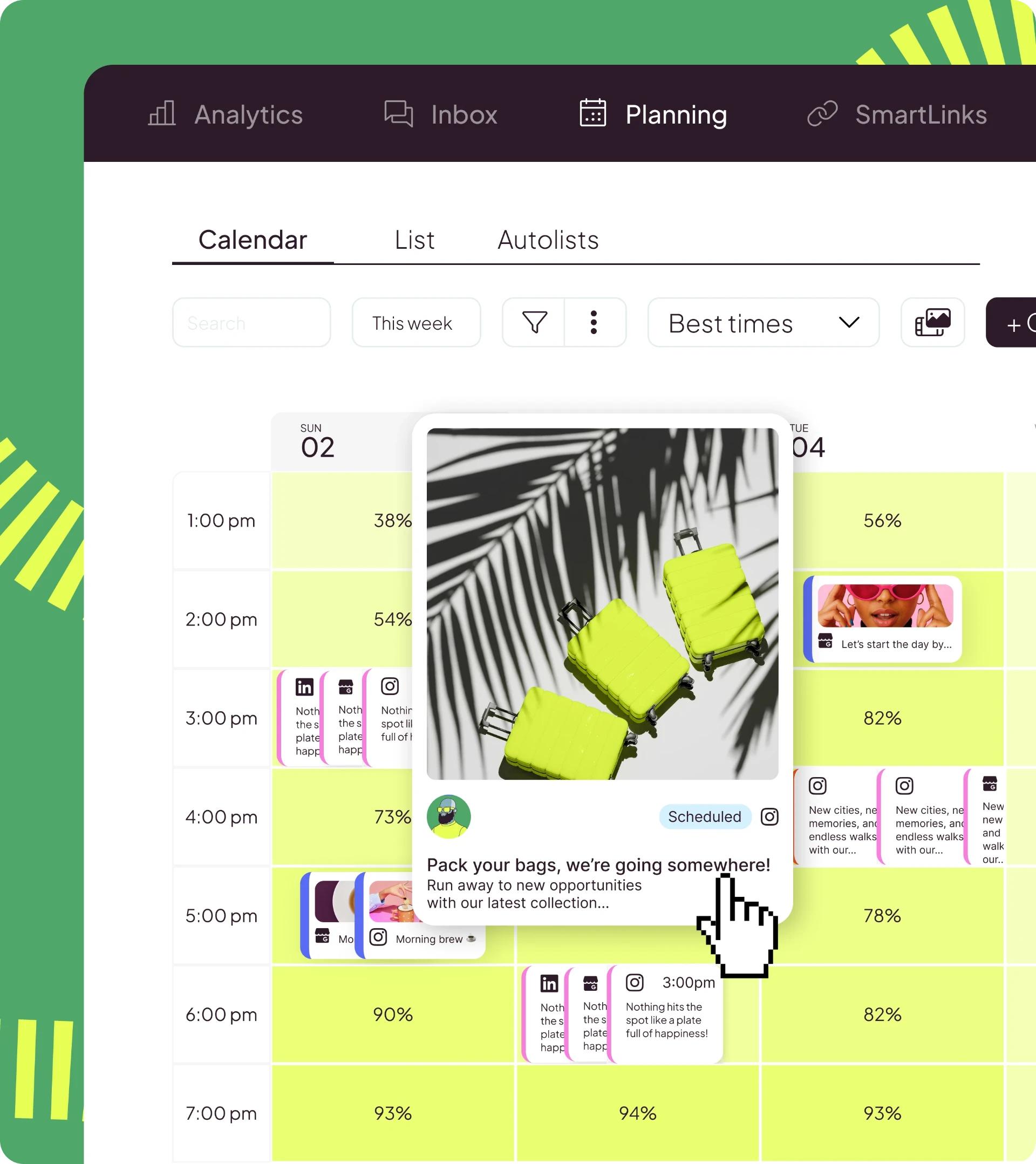 Pensé pour les créateurs de contenu, Planoly permet de planifier vos publications. Par contre, il ne propose pas d’analyse de votre stratégie, de système de validation intégré, de recommandations pour les meilleurs moments personnalisés, ni de génération automatique de rapports de performance.