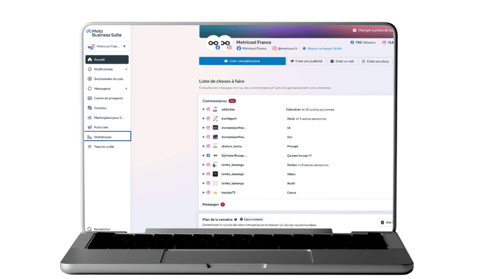- Rendez-vous sur votre page Facebook avec le rôle “administrateur” et cliquez sur “Meta Business Suite” dans le menu de gauche.