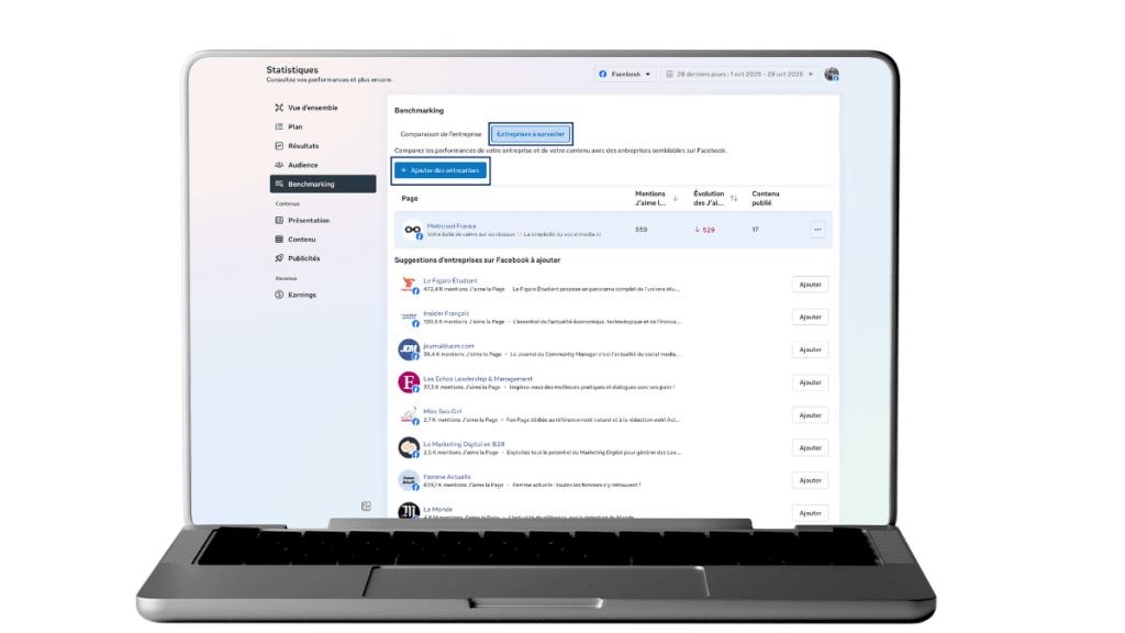 Facebook a pensé à tout (ou presque). Grâce à la fonctionnalité “Pages à surveiller”, vous comparez vos performances à celles d’autres pages, sans quitter la plateforme :