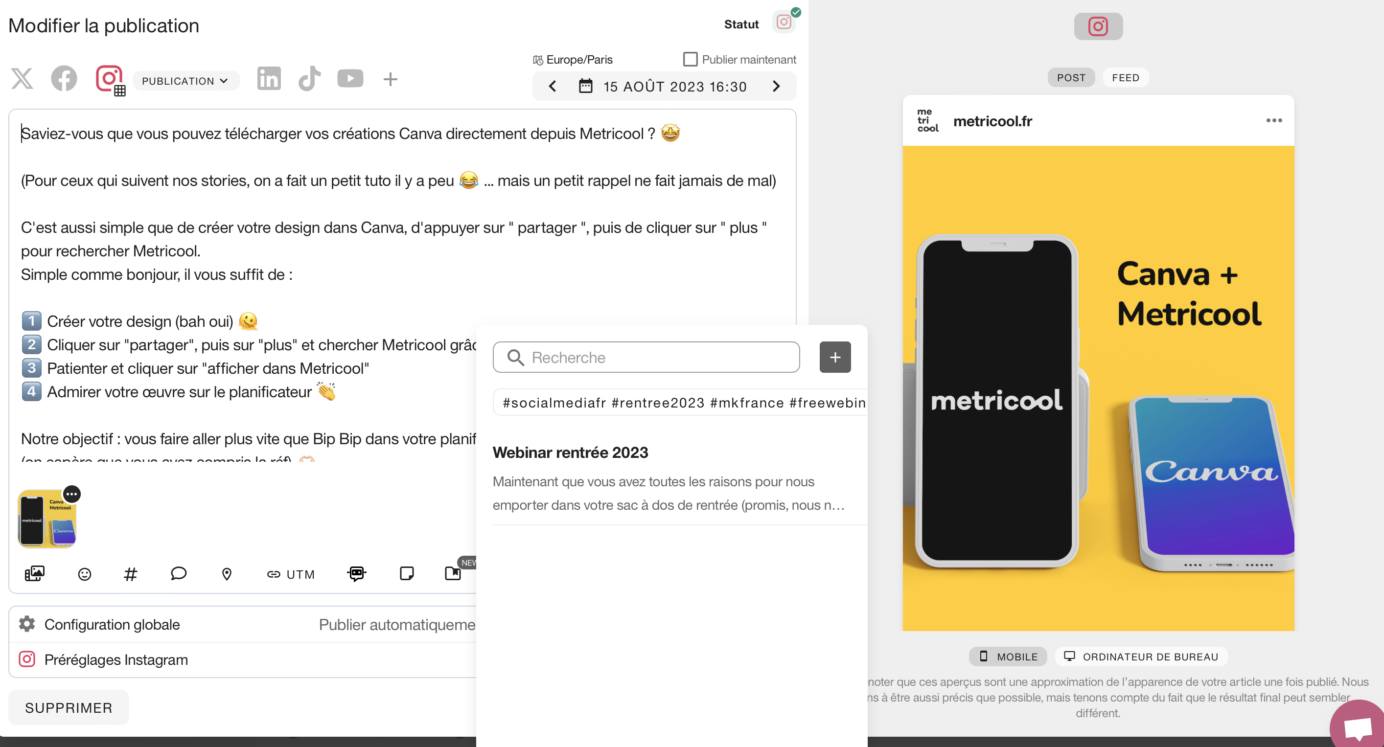 ✅ La description que vous rédigez sera directement intégrée à votre planificateur lorsqu’elle est sélectionnée. Metricool automatisera cette opération en un clic.