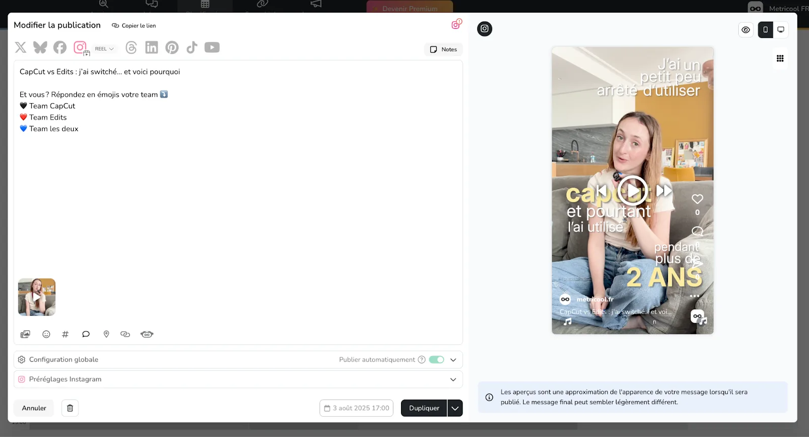 L’outil Metricool vous permet de prévisualiser vos Reels dans votre grille de contenu, avant de le publier.