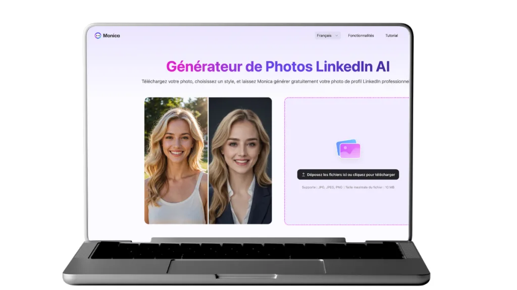➕ Le petit truc en plus : ici, tout est pensé pour LinkedIn. Plus besoin de réfléchir à votre tenue, à l’arrière-plan ou à la lumière. Monica s’occupe de tout, pour un résultat pro et authentique, en quelques secondes.