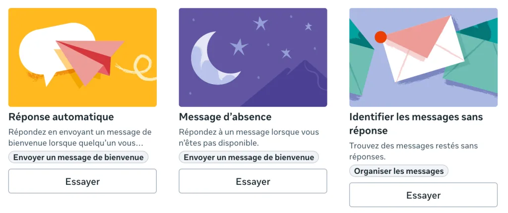 Les messages automatiques vous permettent d’envoyer un message, même si vous n’êtes pas connecté. Comme par exemple un message Facebook de bienvenue ou bien un message d’absence, ou encore le partage de votre localisation et de vos horaires.
