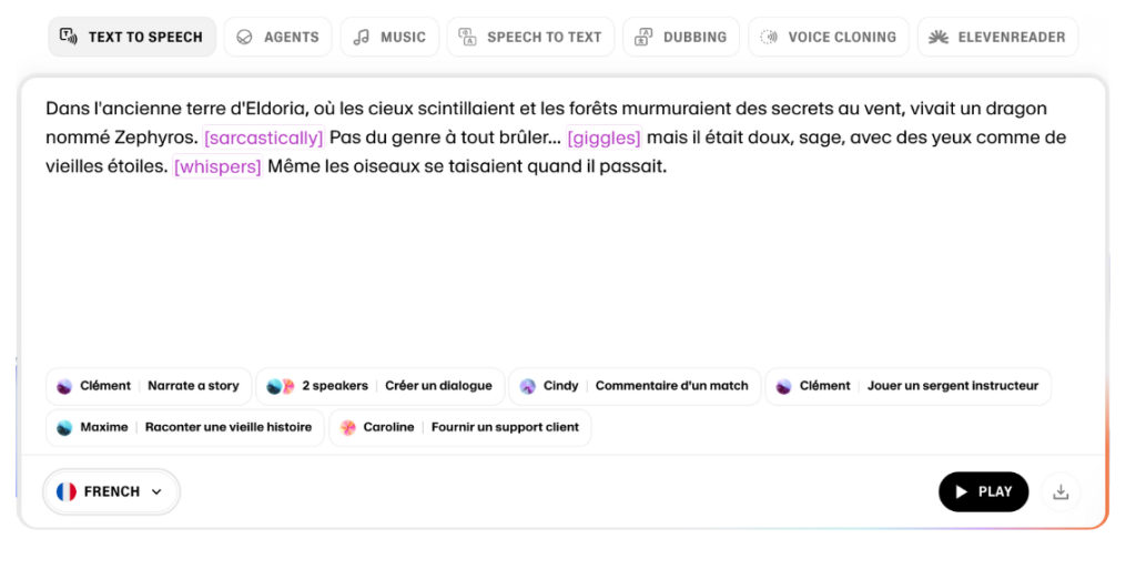 Avec ElevenLabs, donnez vie à vos textes grâce à des voix IA naturelles et expressives. Que ce soit pour vos podcasts, vos vidéos ou vos stories, l’outil transforme n’importe quel texte en narration fluide, dans la langue et le ton que vous souhaitez.