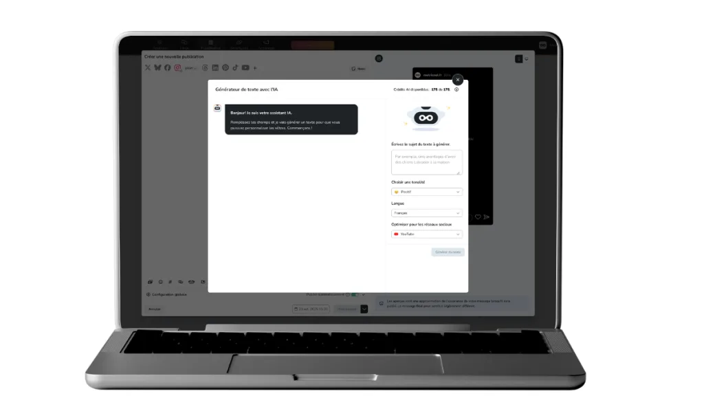 Bonne nouvelle : l’Assistant IA de Metricool sait tout faire. Pensé pour les pros des réseaux sociaux, il écrit, reformule, traduit, et optimise vos textes pour chaque plateforme, YouTube compris.