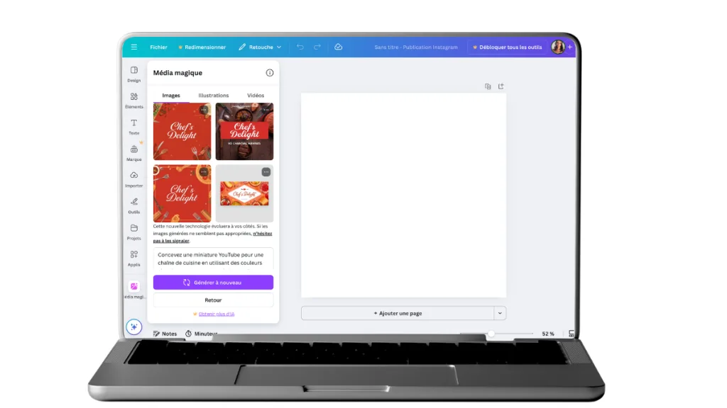 Ouvrez Canva, cliquez sur Applis, puis sélectionnez Média magique™. Décrivez le sujet de votre vidéo, choisissez un style, et laissez l’outil générer une image sur mesure. En quelques secondes, votre miniature est prête à être personnalisée, ajustée ou téléchargée.