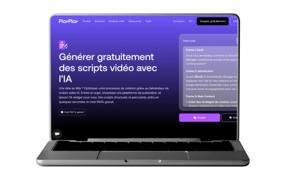 Heureusement, PlayPlay est là pour ça. Son générateur de scripts vidéo IA transforme vos idées en scripts clairs, dynamiques et prêts à tourner en quelques secondes.