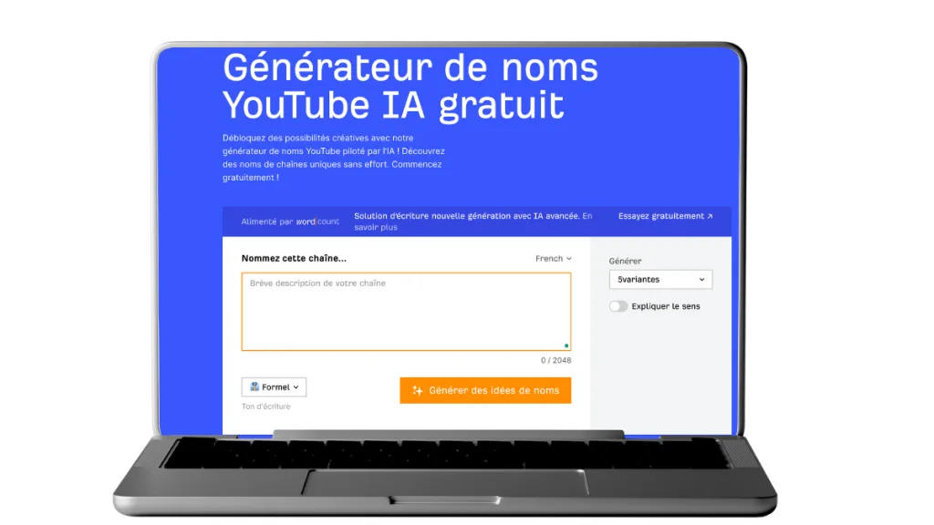 Parce qu’un bon nom de chaîne, c’est ce qu’on retient avant même la première vidéo. Wordcount vous aide à trouver celui qui colle à votre univers, sonne juste et reste en tête. Bref, l’allié parfait pour faire décoller votre marque YouTube dès le départ.