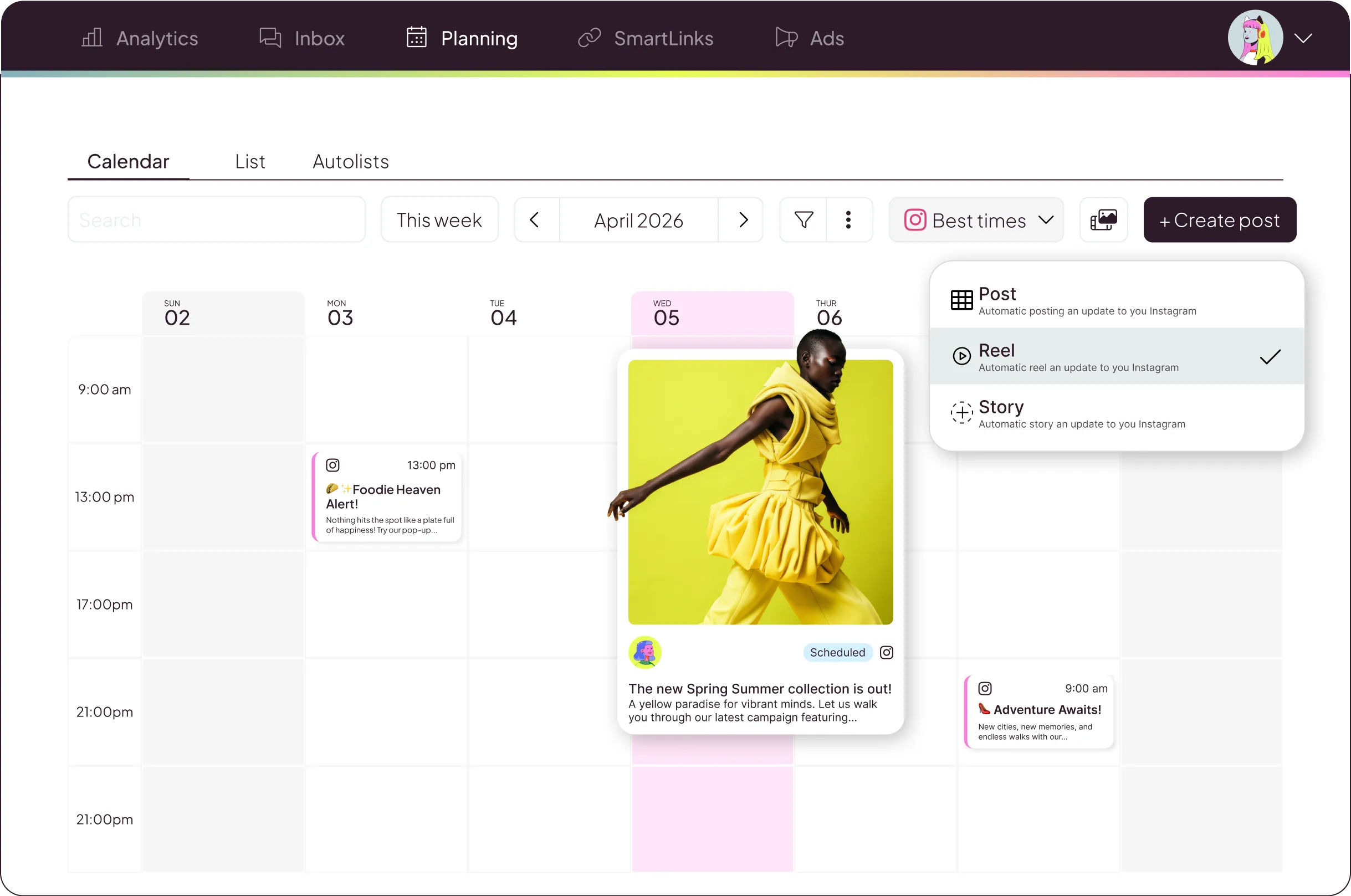 Un seul endroit pour planifier et analyser tout votre contenu Instagram. Posts, stories, Reels et carrousels sous contrôle, en toute simplicité.