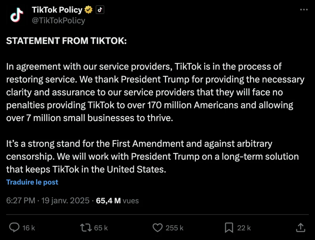« En accord avec nos fournisseurs de services, TikTok est en train de rétablir le service. Nous remercions le président Trump d’avoir apporté la clarté nécessaire et l’assurance à nos fournisseurs de services qu’ils ne subiront aucune pénalité en fournissant TikTok à plus de 170 millions d’Américains et en permettant à plus de 7 millions de petites entreprises de prospérer.