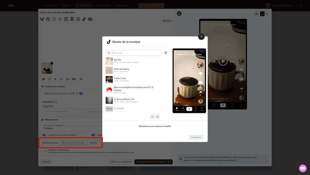 - Gain de temps : planifiez vos publications TikTok avec les musiques tendance à l’avance, ce qui vous permet de gérer plusieurs posts en une seule fois.