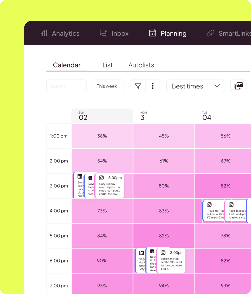 Bien plus qu’un simple calendrier, le planificateur Metricool analyse les abonnés de vos clients pour identifier les meilleurs horaires personnalisés par compte. Connectez vos dossiers Drive ou vos designs Canva, accédez à notre générateur de hashtags, programmez du contenu sur plusieurs réseaux ou générez des listes de contenu automatisées.