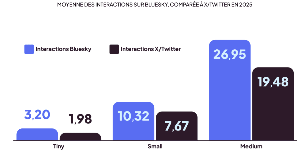 Même si ses performances globales restent inférieures à celles d’autres plateformes de microblogging, les données Metricool montrent des signaux très encourageants : les comptes de moins de 100 000 abonnés génèrent plus d’interactions que sur X/Twitter.