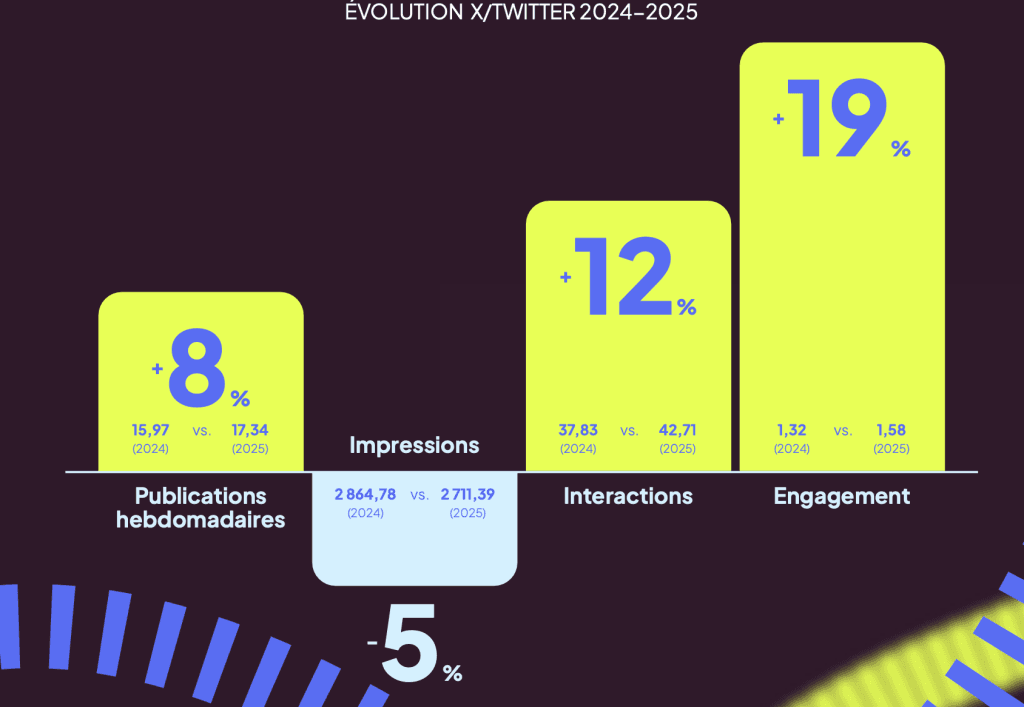 Sur X, les impressions ont reculé de 5 %, mais les interactions ont progressé de 12 %. Cette hausse vient principalement des réponses et des reposts avec commentaire, qui restent ce qui alimente le plus la conversation.