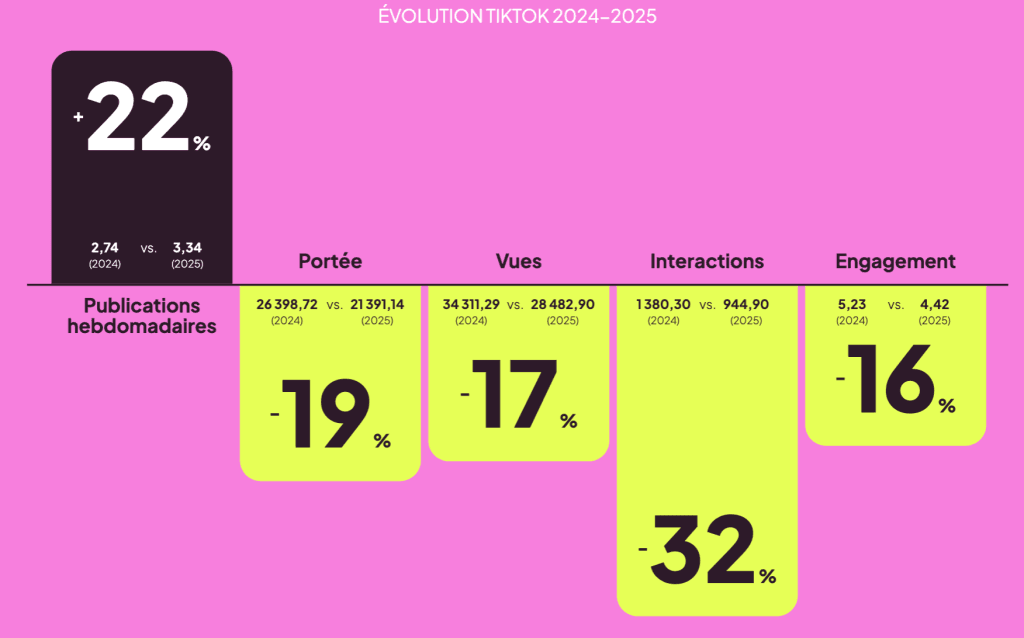 TikTok reste au sommet, mais 2025 a envoyé un signal clair : publier davantage ne signifie pas forcément mieux réussir. Les performances sont en baisse par rapport à 2024. Les vues ont baissé de 17 %, la portée de 19 % et les interactions de 32 %. Il y a plus de contenu que jamais et il devient de plus en plus difficile de se démarquer.