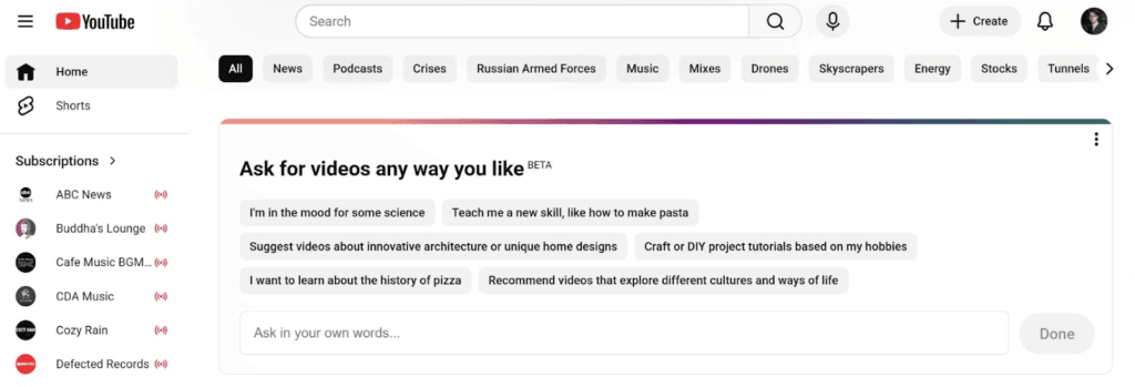YouTube s’est également lancé dans cette tendance avec la fonction “Votre feed personnalisé”. Il suffit d’indiquer à un chatbot le contenu que vous souhaitez voir, et le fil s’adapte automatiquement à cette thématique.