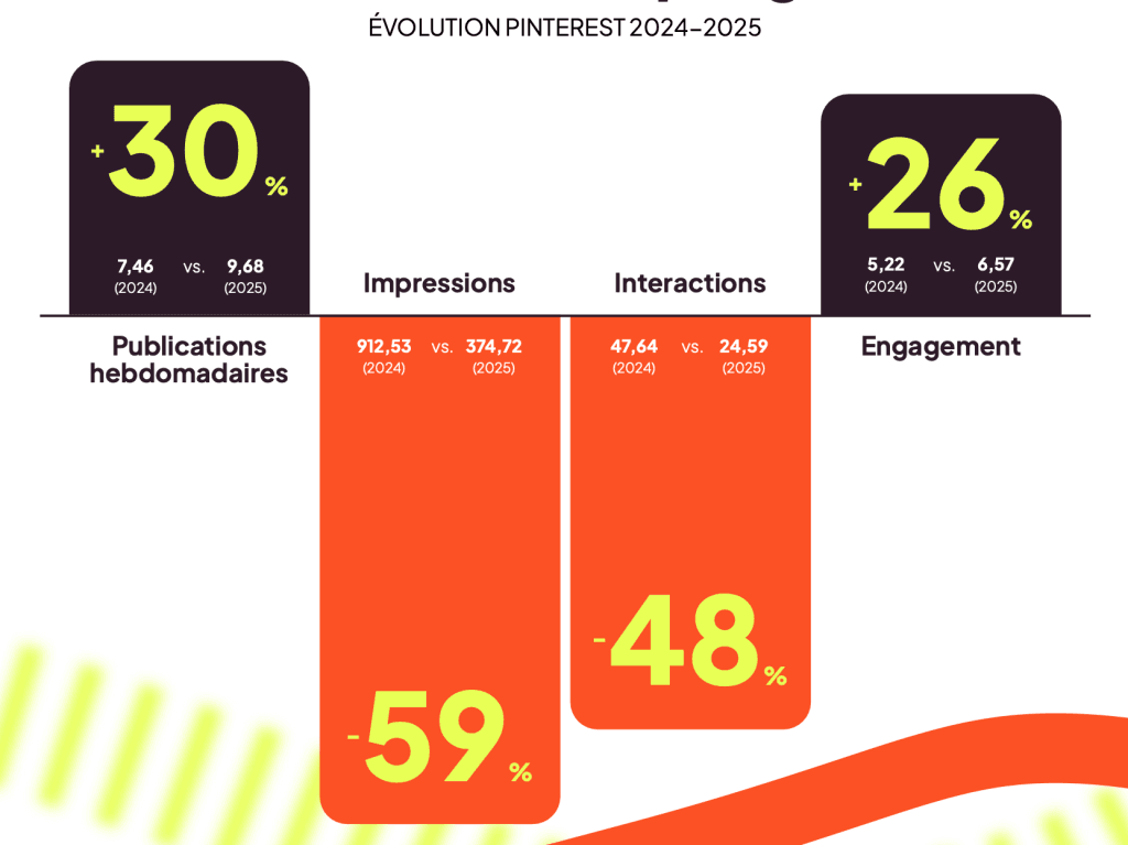 Globalement, Pinterest évolue vers un environnement plus concurrentiel, avec moins d’impressions par publication, mais une portée globale plus large : la plateforme touche davantage d’utilisateurs, même si les contenus se disputent plus l’attention.