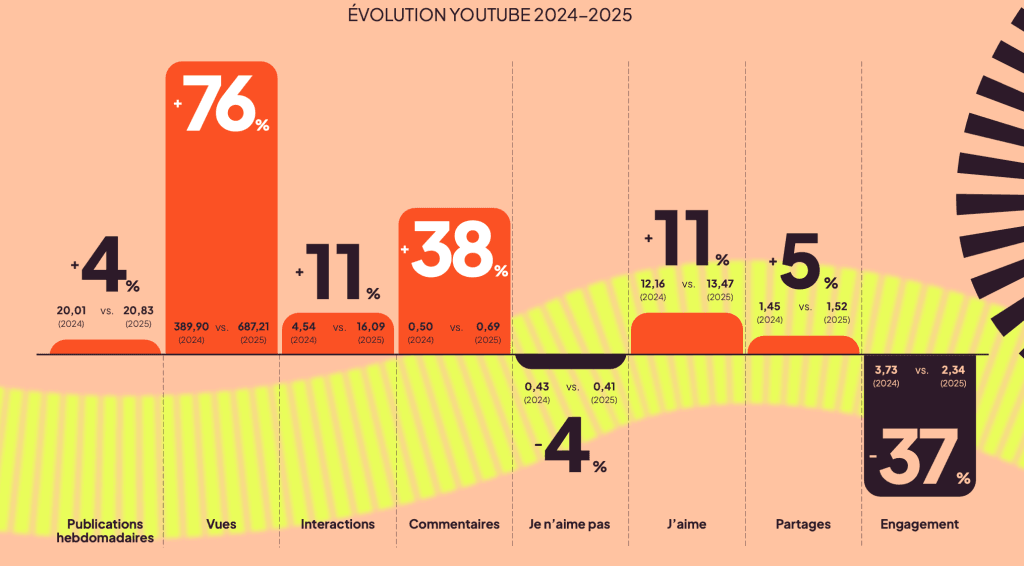 Les interactions ont également progressé de 11 %, tout comme le volume de publication (+53 %), preuve que de plus en plus de créateurs misent sur YouTube.