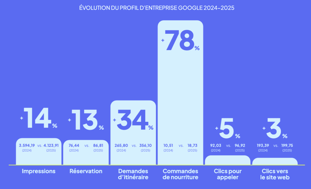 Et les données Metricool le confirment : en 2025, les demandes d’itinéraire ont augmenté de 34 %, les commandes de repas de 78 % et les impressions de recherches sur mobile de 30 %. Un Profil d’entreprise ne se contente pas de montrer votre activité : il soutient activement sa visibilité.