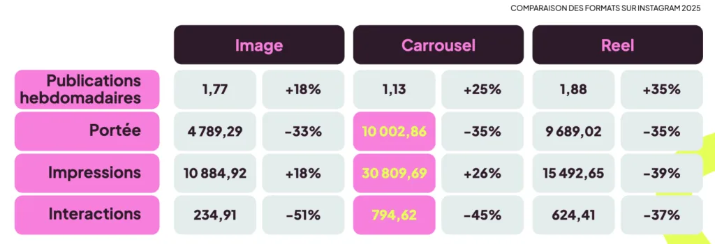 Alors, oui, les Reels continuent de générer beaucoup d’interactions, mais ce sont les carrousels qui offrent les meilleurs résultats en termes de portée, d’impressions et d’engagement. Et pourtant, peu de comptes les utilisent.