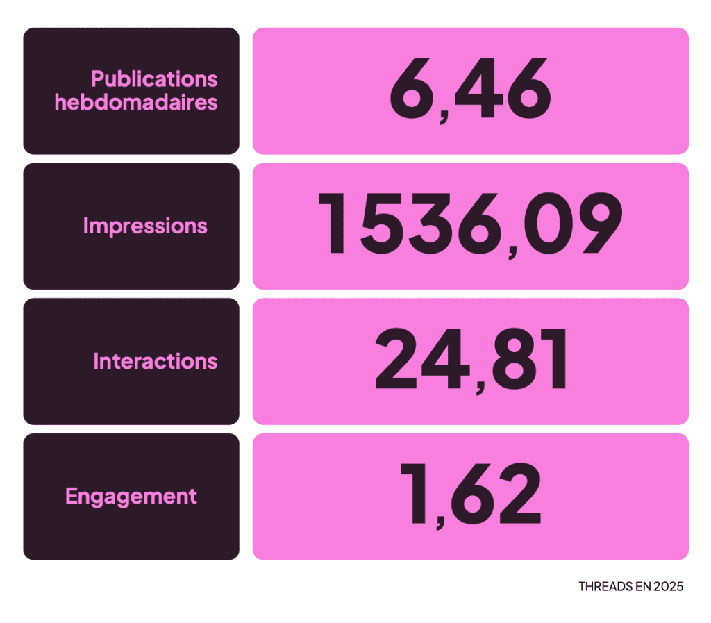 Threads continue de croître sans ralentir : la plateforme dépasse désormais les 400 millions d’utilisateurs mensuels, avec en moyenne environ 1 500 impressions par publication.