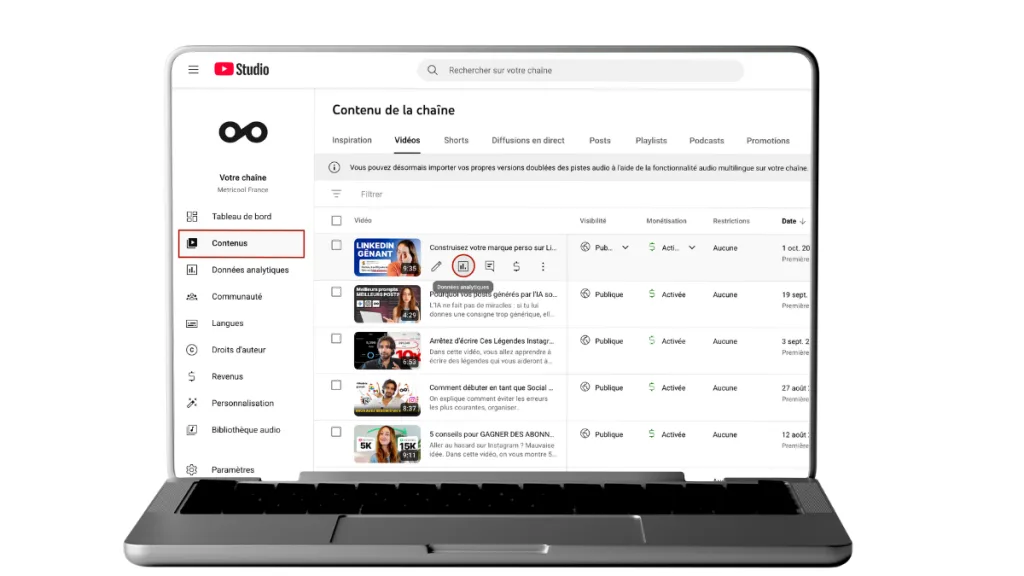 Absolument. Si YouTube Analytics est l’outil officiel pour suivre vos performances, il a ses limites. Pour une vision plus complète de votre présence en ligne, Metricool est une alternative à considérer.