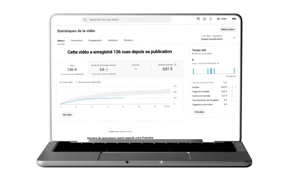 | Le nombre de vues indique combien de fois vos vidéos ont été regardées. Même s’il peut sembler superficiel, cet indicateur reste clé pour mesurer la portée de vos contenus et l’intérêt qu’ils suscitent dès les premiers instants. | Suivez les tendances pour voir si votre chaîne grandit et comparez les vues selon le type de contenu pour comprendre ce qui attire votre audience. |