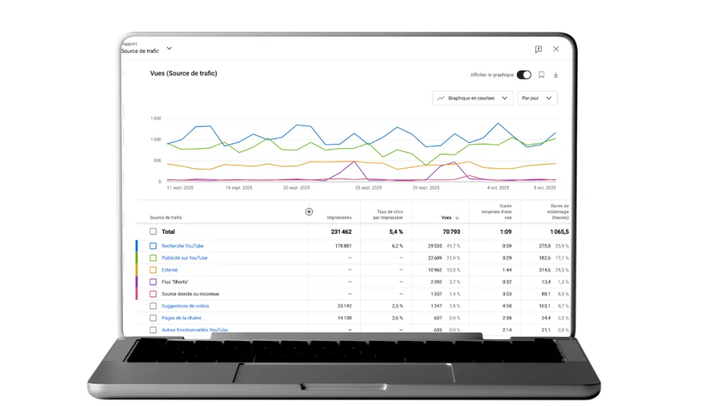 | Les sources de trafic indiquent d’où viennent vos spectateurs : YouTube, vidéos suggérées, navigation, sites externes, liens directs, etc. Elles montrent comment votre contenu est découvert et l’efficacité de vos actions marketing. | Un trafic élevé depuis YouTube signifie que votre SEO fonctionne. Les vidéos suggérées en hausse montrent que l’algorithme recommande vos contenus. Un trafic externe élevé reflète une promotion efficace sur les réseaux sociaux ou votre site web. |