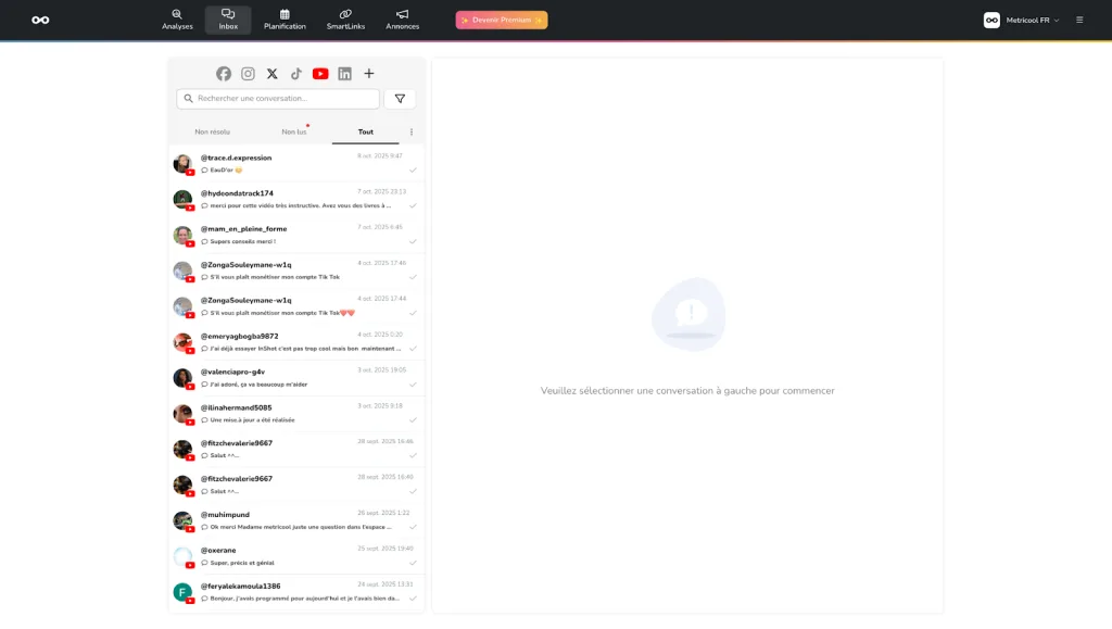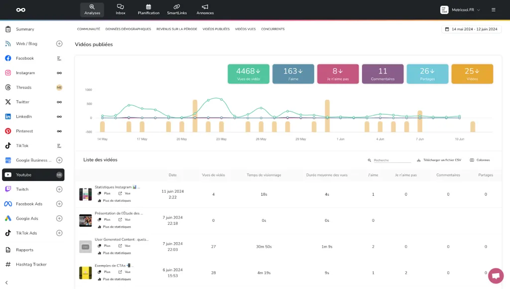 Avec Metricool, vous ne vous contentez pas de lire vos chiffres : vous analysez, comparez et optimisez vos résultats sur YouTube, mais aussi sur toutes vos autres plateformes (Instagram, TikTok, Facebook, LinkedIn, Pinterest, X…).
