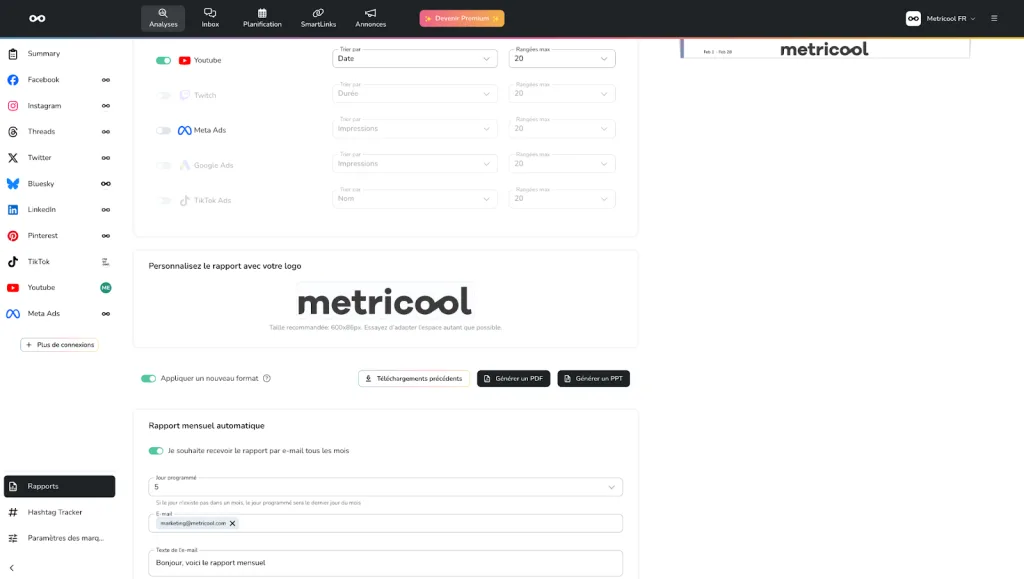📊 Rapports automatiques et personnalisables : créez en un clic des rapports clairs et visuels qui incluent vos données YouTube. Idéal pour présenter vos résultats à vos clients ou à votre équipe.