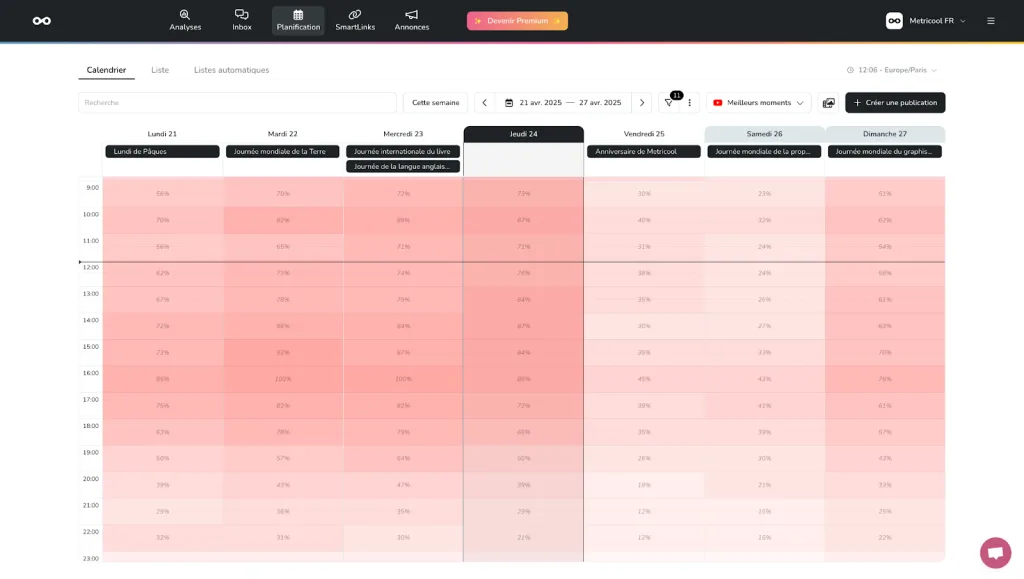🗓️ Planification quand l’audience est active : en plus de l’analyse, Metricool vous permet non seulement de programmer vos vidéos YouTube depuis le même tableau de bord, mais aussi d’identifier les meilleurs moments pour les publier.