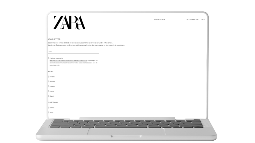 Plutôt qu’un simple push commercial, Zara propose un ’e-mail personnalisé. L’utilisateur choisit ses centres d’intérêt (mode, lifestyle, nouveautés, etc.), et reçoit chaque semaine un condensé de tendances, comme une sélection sur-mesure.