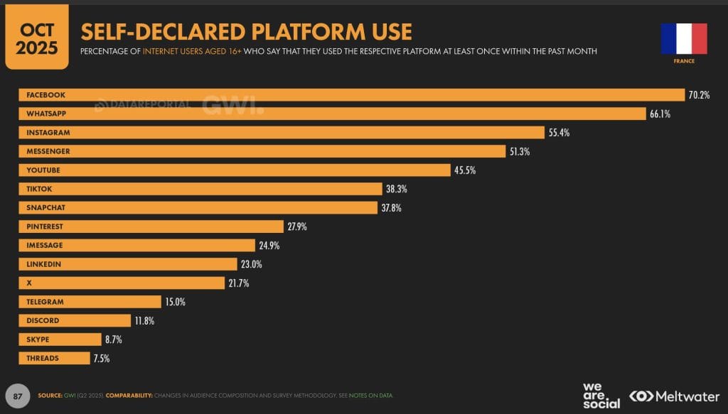 Selon le Digital Report 2026, les usages des réseaux sociaux en France restent dominés par quelques plateformes majeures, tandis que d’autres continuent de progresser ou de s’installer durablement dans les habitudes des utilisateurs.