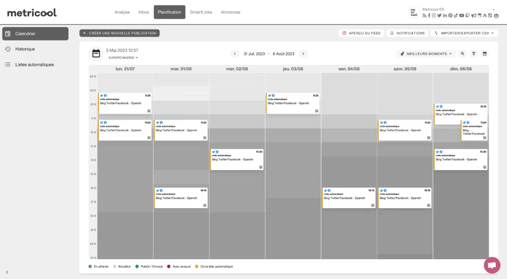 Une fois la vidéo créée, il est temps de la promouvoir sur les réseaux sociaux. Publiez ou programmez votre vidéo en sélectionnant les heures de pointe indiquées sur le planificateur de Metricool pour maximiser l’exposition. N’oubliez pas d’inclure des hashtags pertinents pour atteindre un public plus large.