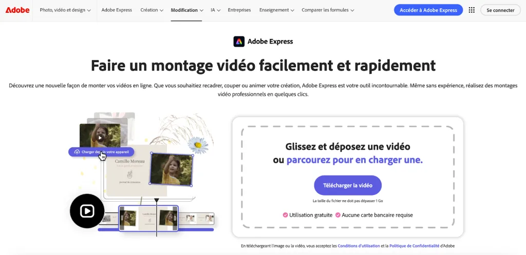 Vous ne maîtrisez pas Adobe Premiere Pro ou vous le trouvez trop coûteux ? Adobe Express vous permet de créer des vidéos rapidement grâce à des modèles prédéfinis et une interface intuitive, plus simple et moins chère qu’Adobe Premiere Pro. Vous pouvez facilement ajouter textes, images, transitions et musiques en quelques clics.