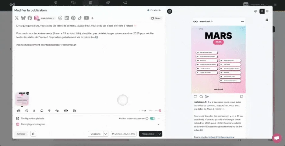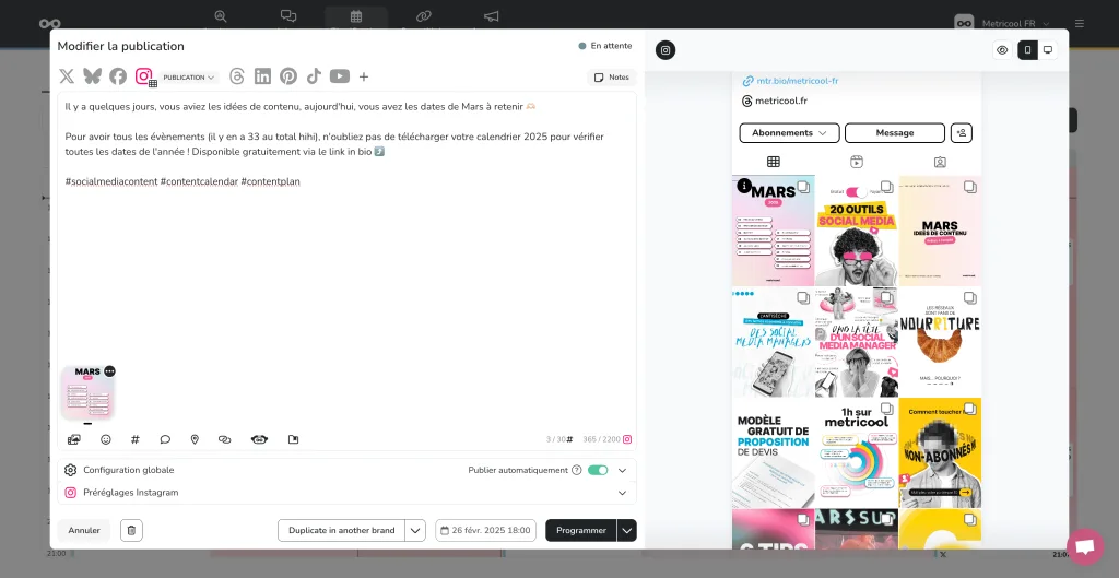 Si vous gérez plusieurs marques et voulez gagner du temps, cette fonctionnalité est faite pour vous ! Depuis le planificateur, cliquez sur « Dupliquer dans une marque« , puis sélectionnez une ou plusieurs marques où le post sera copié.