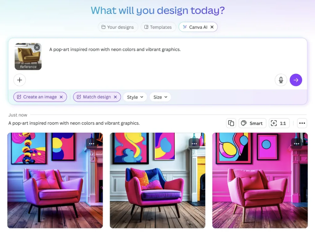 L’IA de Canva ne se contente pas de générer des images à partir d’un prompt. Avec Magic Design, vous importez un texte ou un visuel, et l’outil crée automatiquement plusieurs déclinaisons adaptées aux formats LinkedIn, Instagram ou encore présentations.