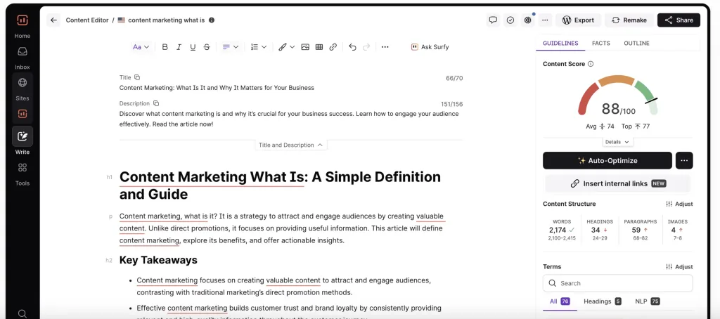 Surfer SEO analyse les pages les mieux classées sur Google et vous guide pour rédiger des contenus réellement compétitifs. L’IA vous indique la structure idéale, les mots-clés à insérer et le volume recommandé.