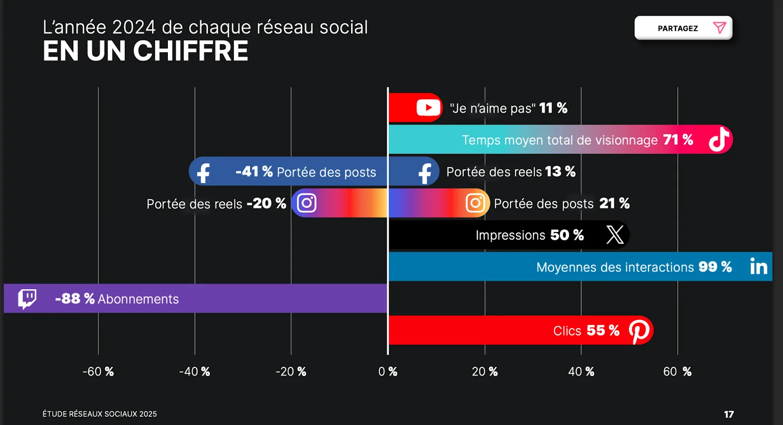 Facebook, le géant des réseaux sociaux | Avec plus de 3 milliards d’utilisateurs actifs mensuels, Facebook reste une plateforme incontournable. Les Reels, par exemple, continuent d’afficher une belle performance, avec une portée en hausse de 13,29 %. | Si votre objectif est de diriger du trafic vers votre site, Facebook reste une valeur sûre. |
