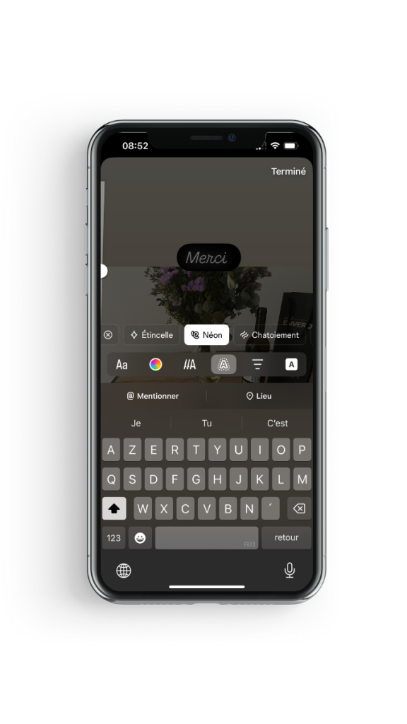 - Appliquer un effet visuel pour renforcer l’impact du message (comme Étincelle, Néon, Pixel…).