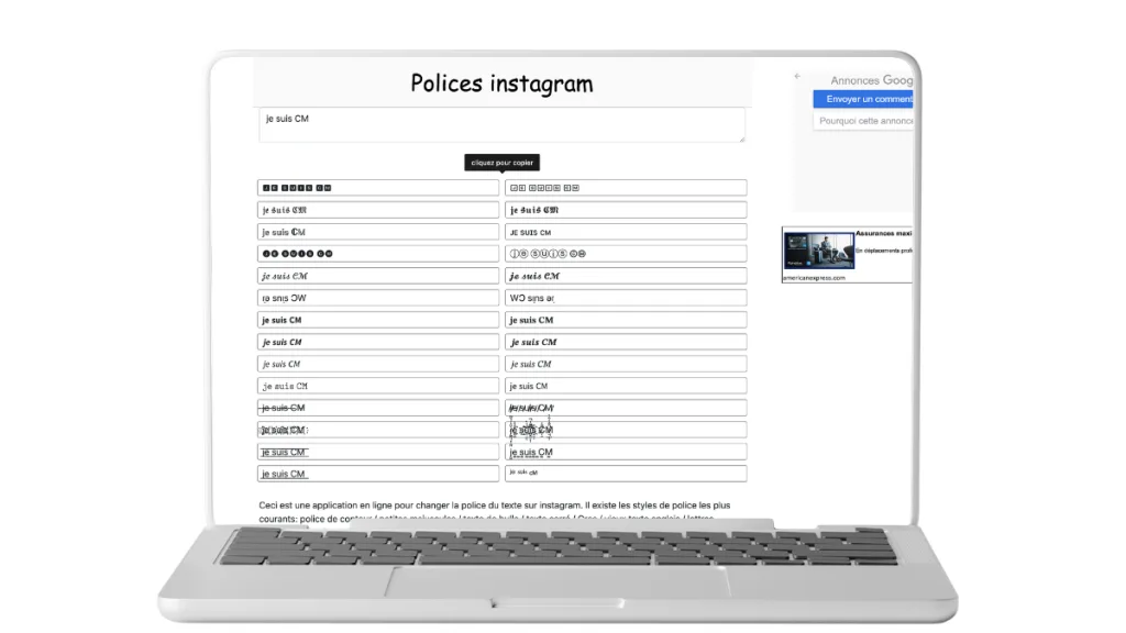 Un incontournable. Il suffit d’écrire votre texte sur le site Instagram Fonts, de choisir parmi des dizaines de styles, puis de copier-coller le résultat directement dans votre bio, vos légendes ou vos stories.