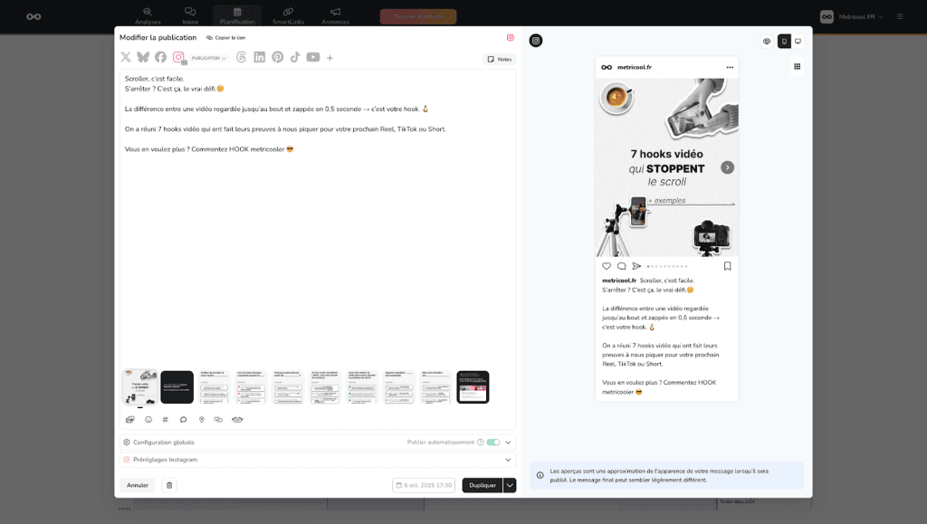 Voilà : votre post est prêt, parfaitement optimisé, et vous maîtrisez tout. Plus besoin de jongler entre applis, comptes et contraintes !