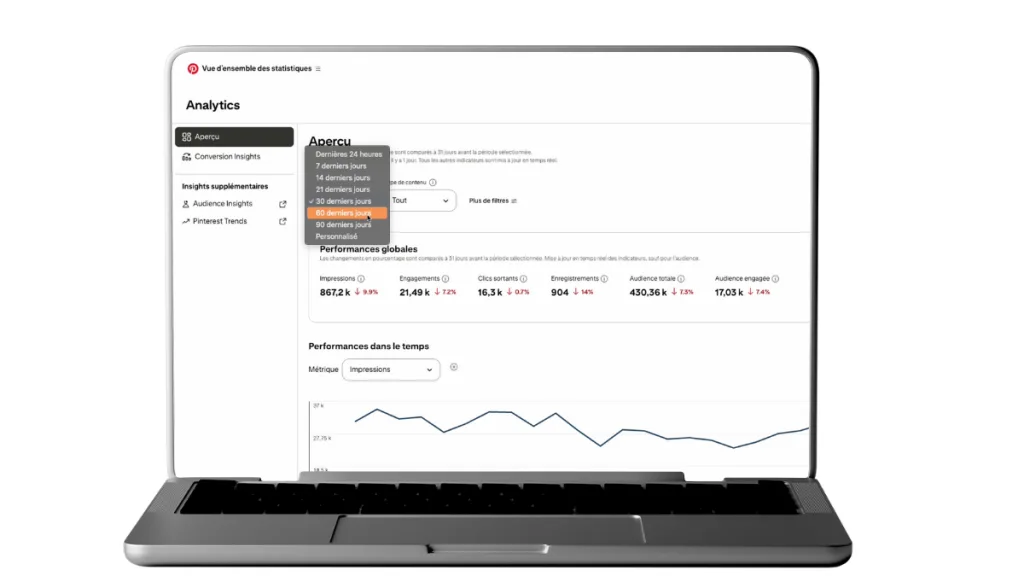Une fois votre rapport Pinterest configuré, vous accédez à plusieurs types de données pour comprendre l’impact de vos contenus :